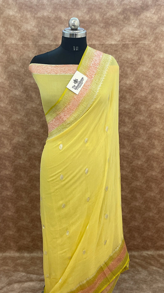 Yellow Crepe Georgette Pure Banarasi Saree — Handbrush Zari Floral Motif