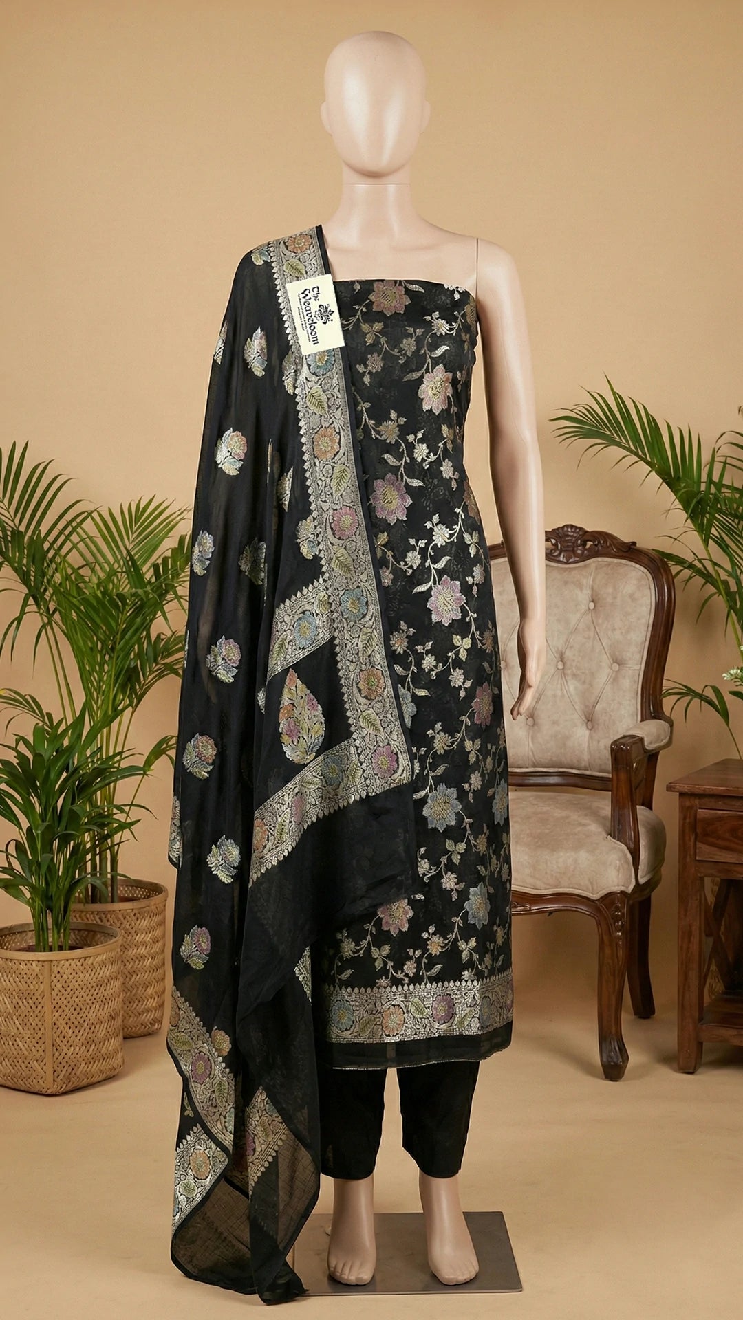 The deep black base (100% Colour Customization Option Available) forms the perfect canvas for soft multicolour floral motifs created using delicate Banarasi zari patterns. The contrast is subtle yet impactful, making the suit versatile for both grand and intimate occasions.