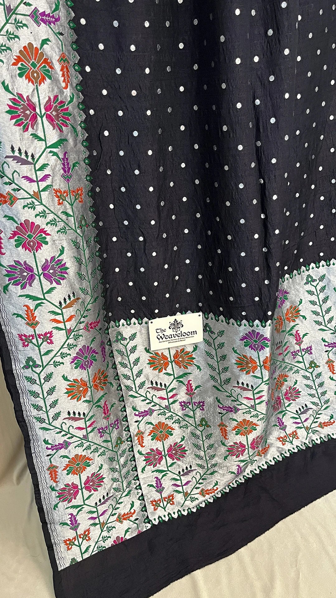 This elegant drape, available on The Weaveloom, is a refined piece in luxurious black (100% Colour Customization Option available). Adorned with shimmering silver zari polka butis across the body and completed with a captivating multicolour meenakari floral border, it's the kind of saree that turns heads and starts conversations.