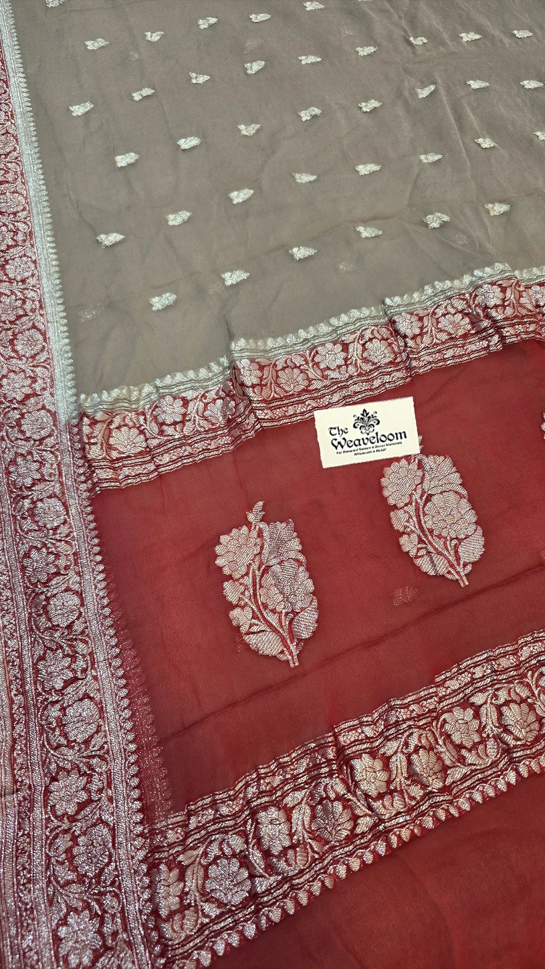 - Premium khaddi georgette Banarasi saree with silver zari detailing