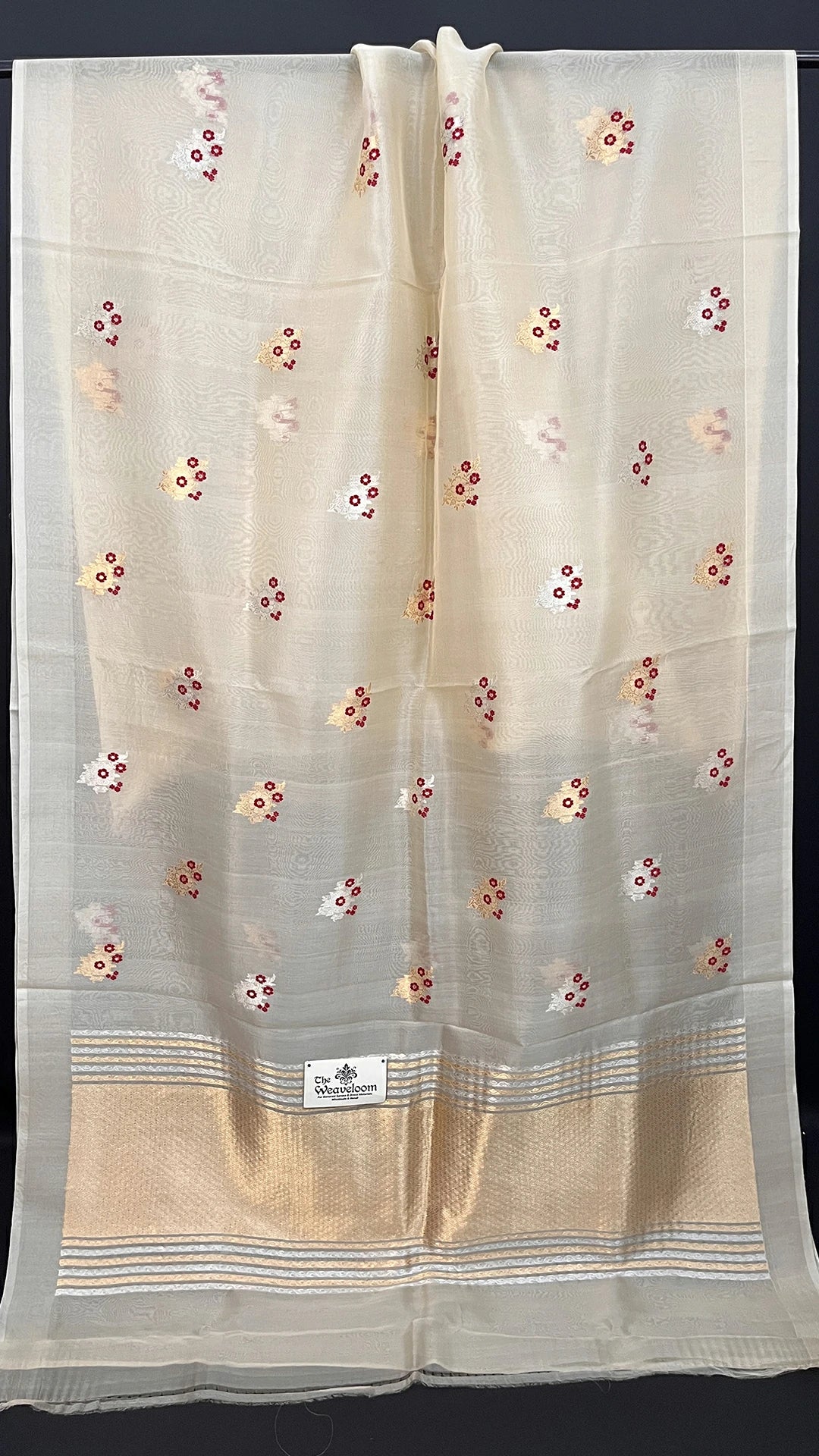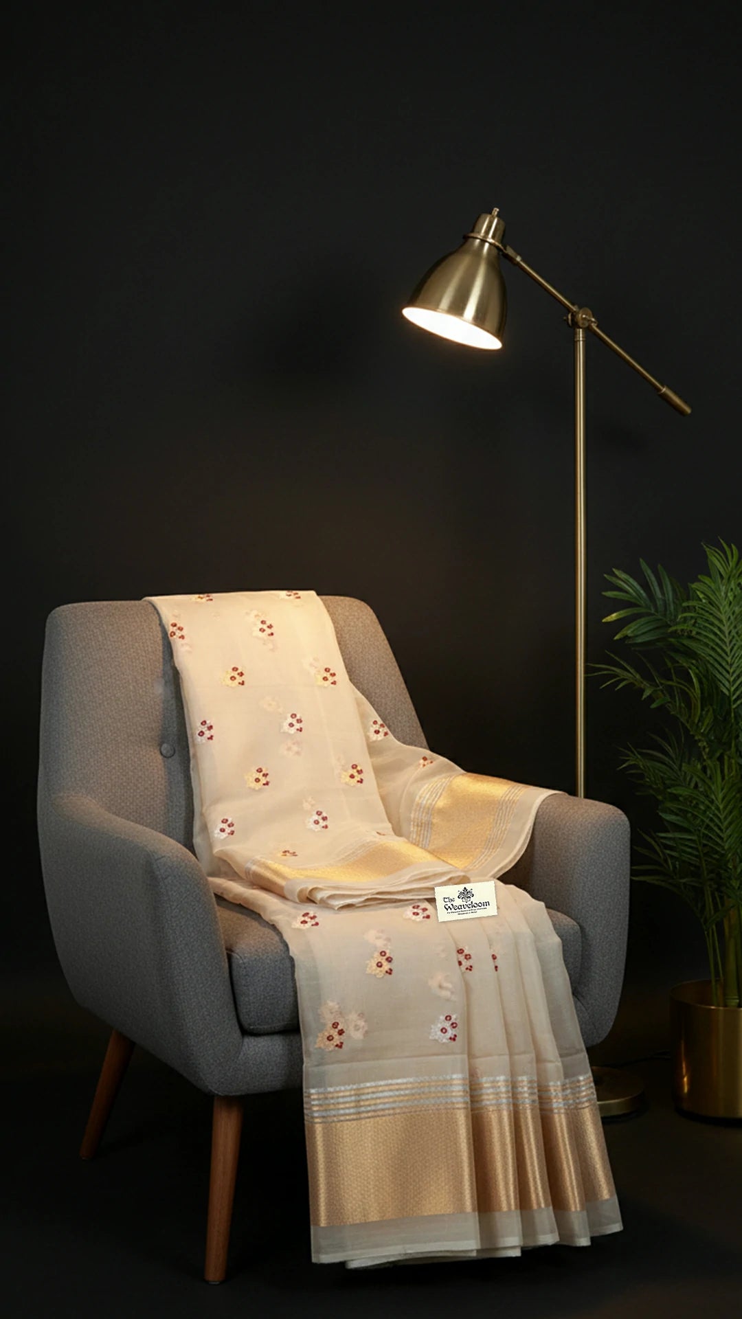 This saree is perfect for purchasing online because its visual language is simple and honest: a cream base (we provide 100% Colour Customization Option) in pure Kora silk with handwoven kadwa technique creating a firm, structured drape. The Meenakari floral butis are woven in petite clusters — red and white tonal inlays resting on tiny gold backings — giving you small pops of color without overpowering the elegance.