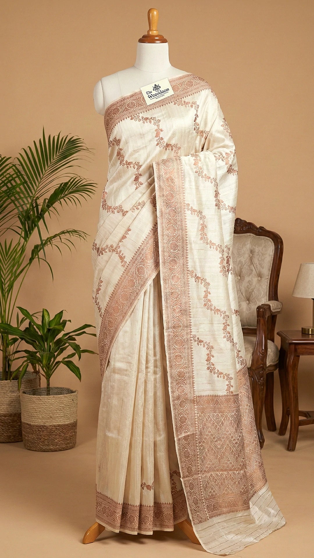 - Cream pure raw silk Banarasi saree with antique zari floral motifs