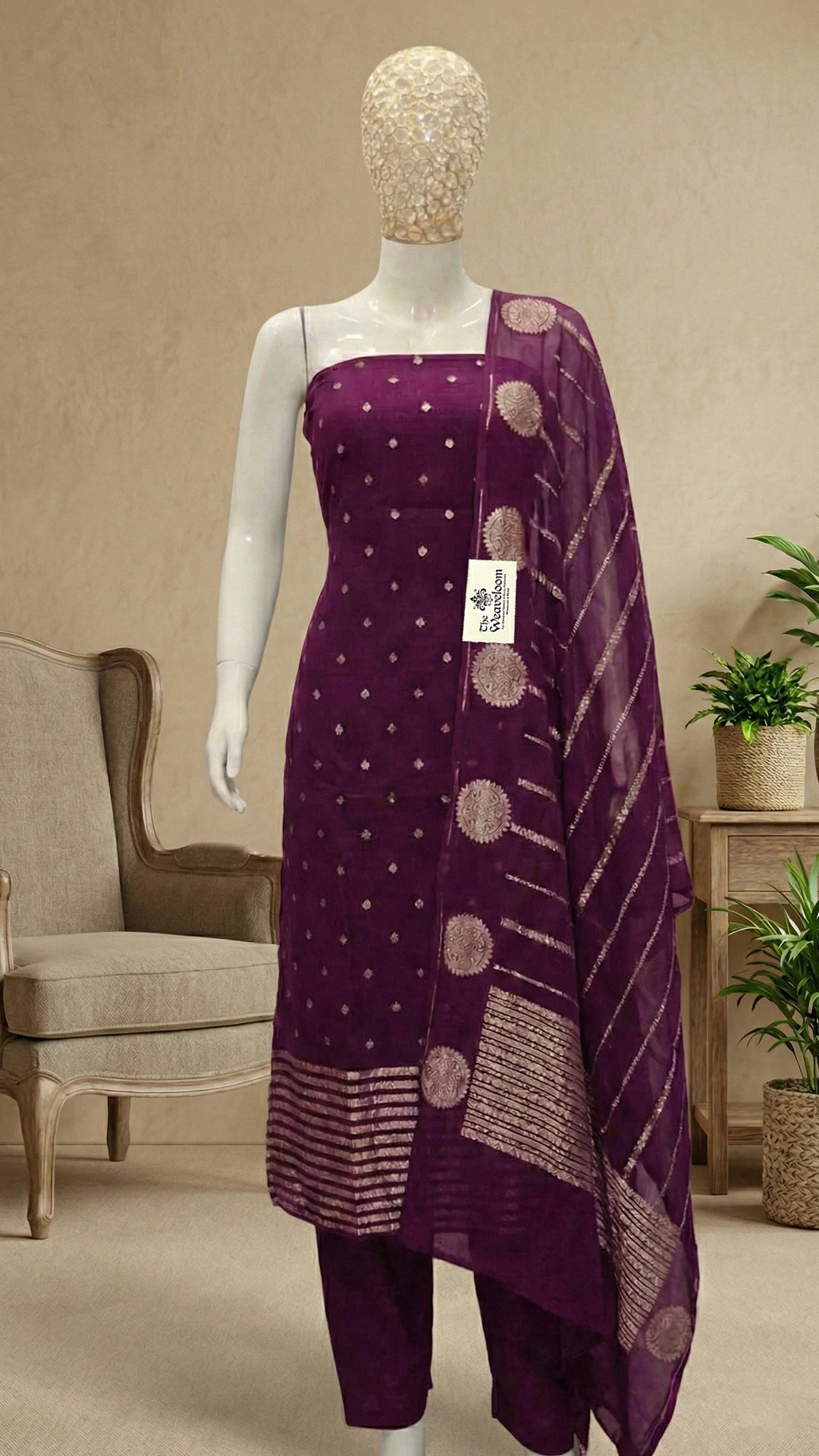 This magenta Banarasi suit material is especially suited for festive gatherings, wedding functions, engagement ceremonies, and traditional celebrations. The color carries a celebratory warmth, while the zari work reflects heritage craftsmanship.