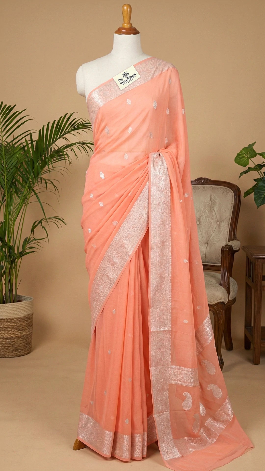 Peach Khaddi Georgette Pure Banarasi Saree with Silver Zari Border & Paisley Pallu