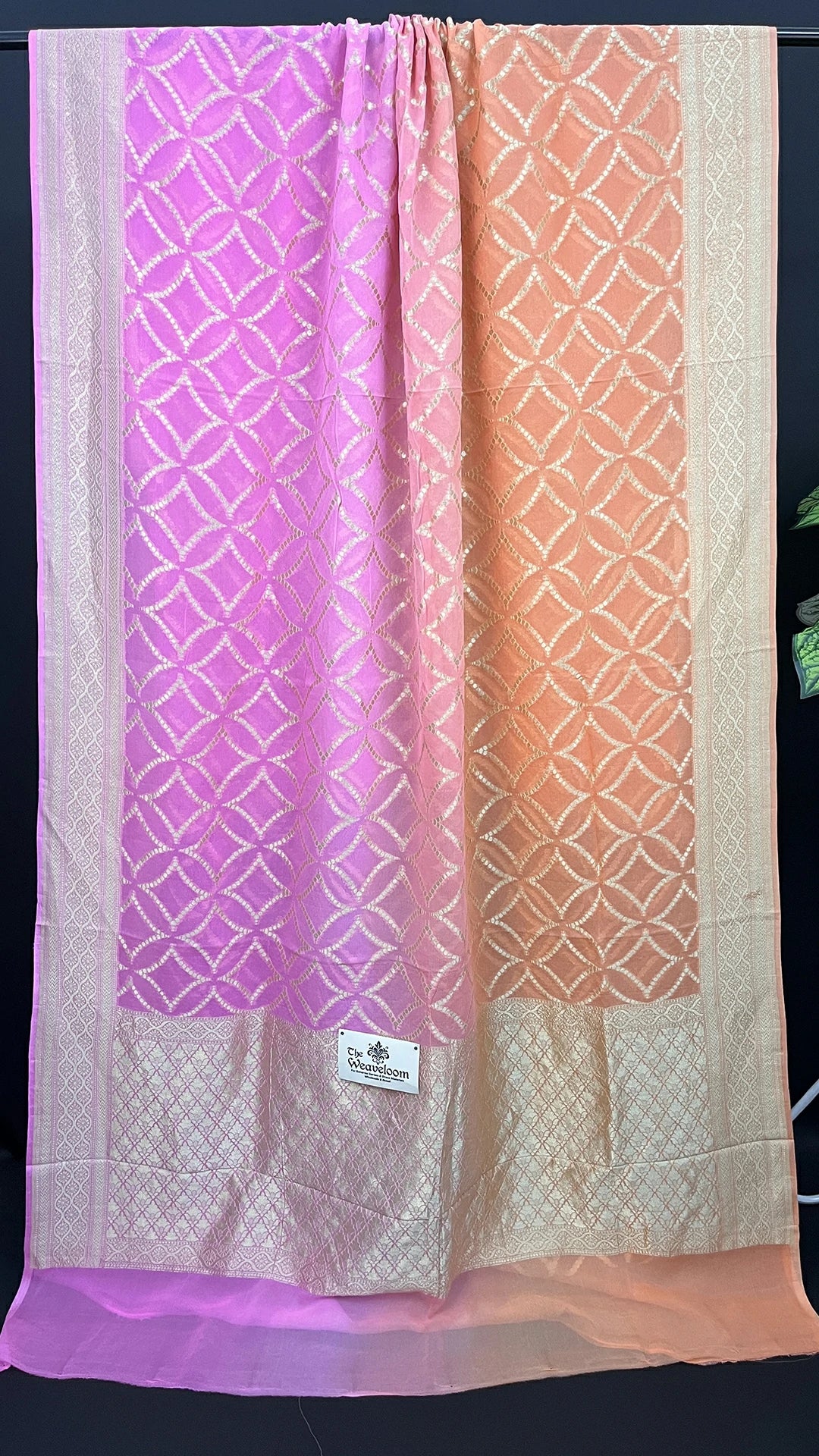 Pink & Peach Dual Shade Khaddi Georgette Banarasi Saree with Water Zari Lattice Pattern