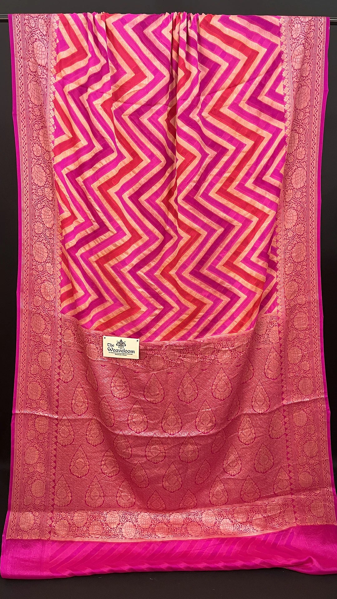 - Premium crepe georgette Banarasi saree with vibrant pink rangkat multicolor chevron pattern