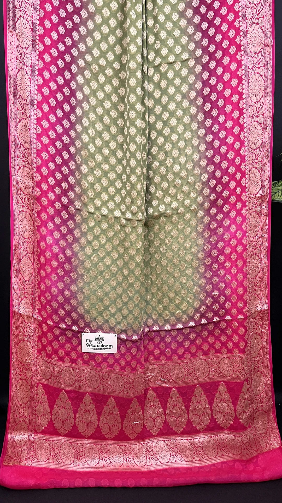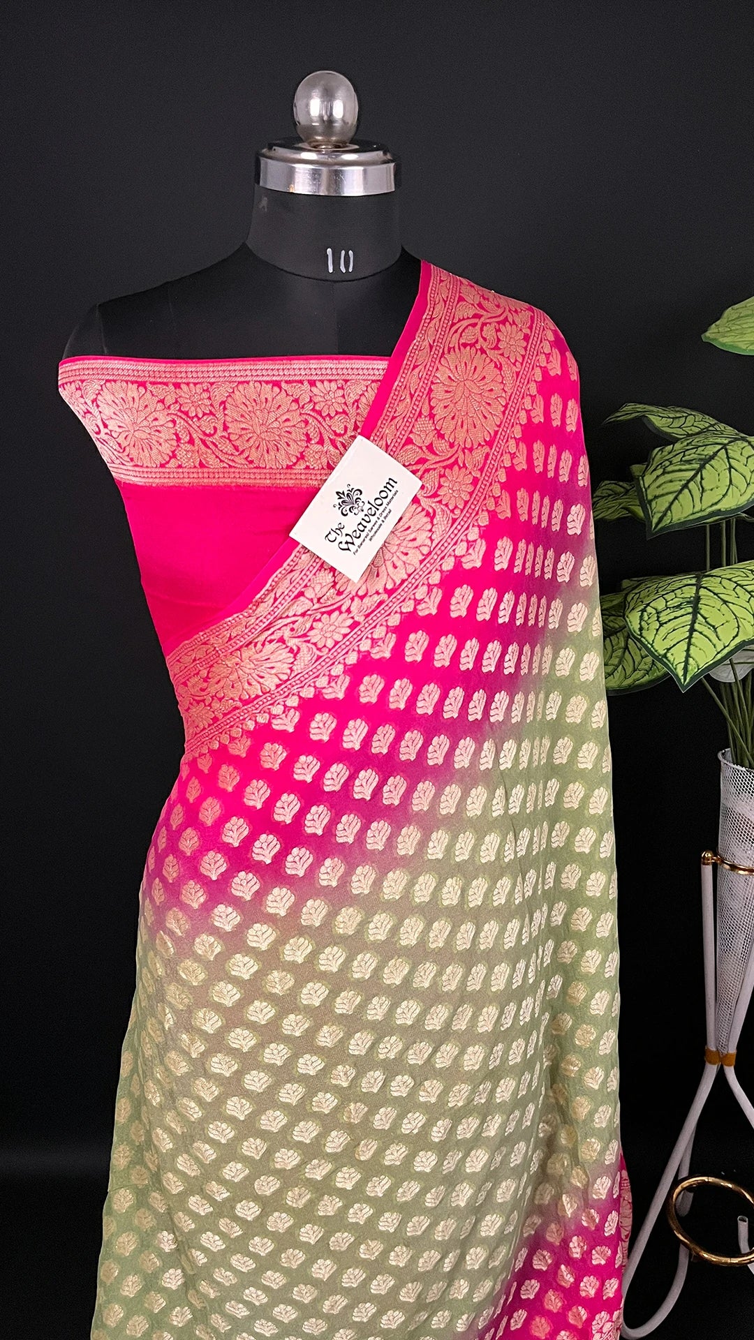 Pure Crepe Georgette Banarasi Saree in Pista & Strawberry Dual Tone with Golden Zari