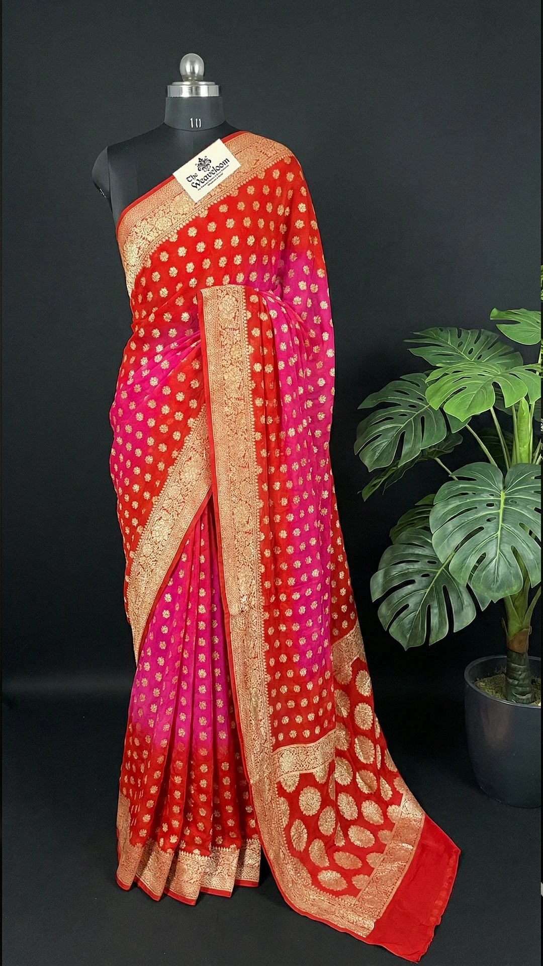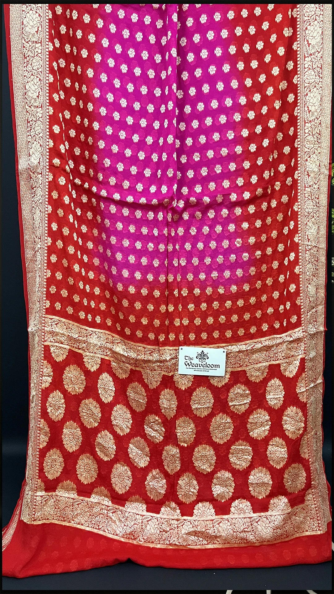 Rani & Red Dual Tone Pure Crepe Georgette Banarasi Saree with Golden Zari Booti