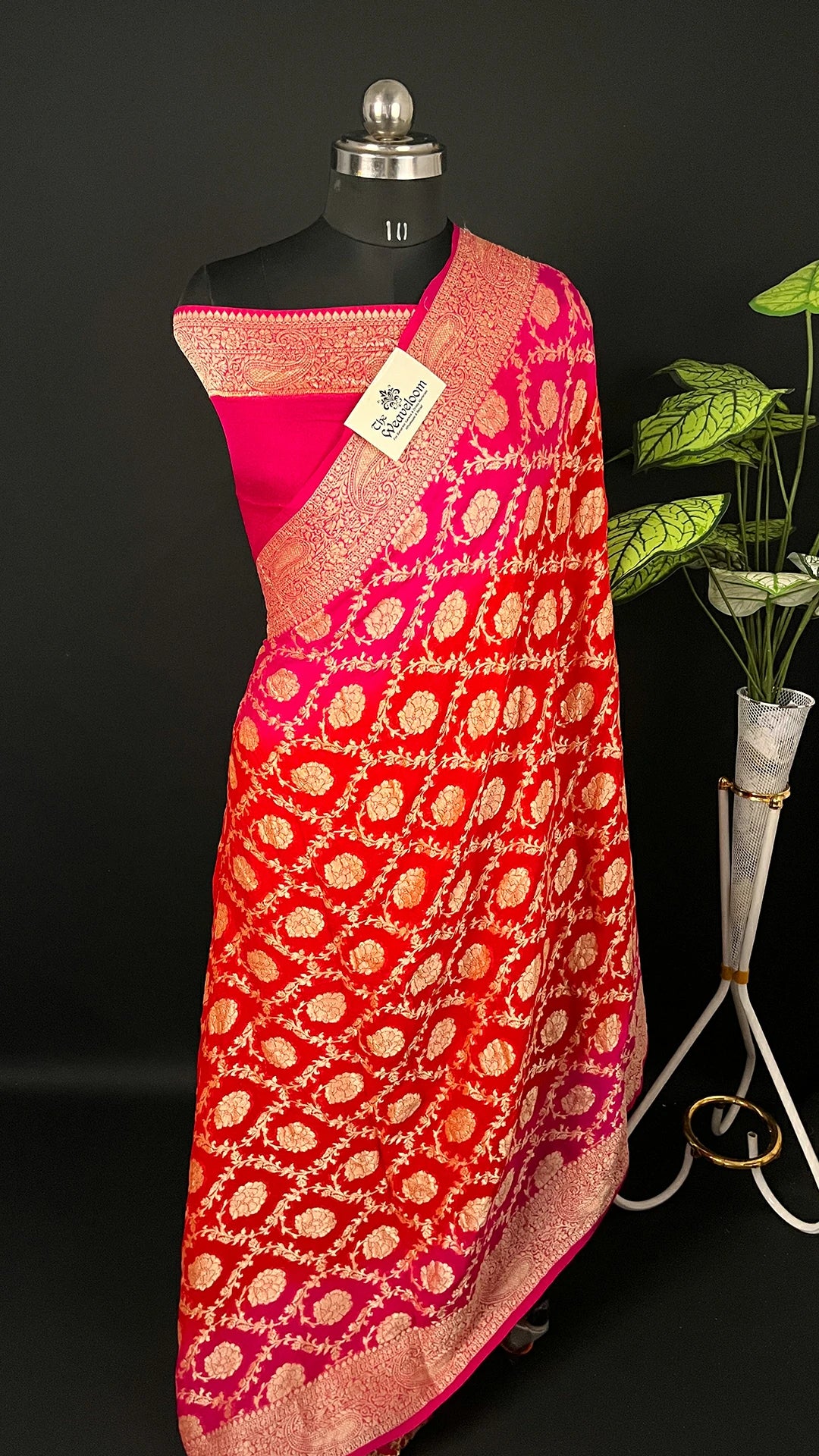 Red & Rani Dual Tone Pure Crepe Georgette Banarasi Saree with Golden Zari Floral Pattern