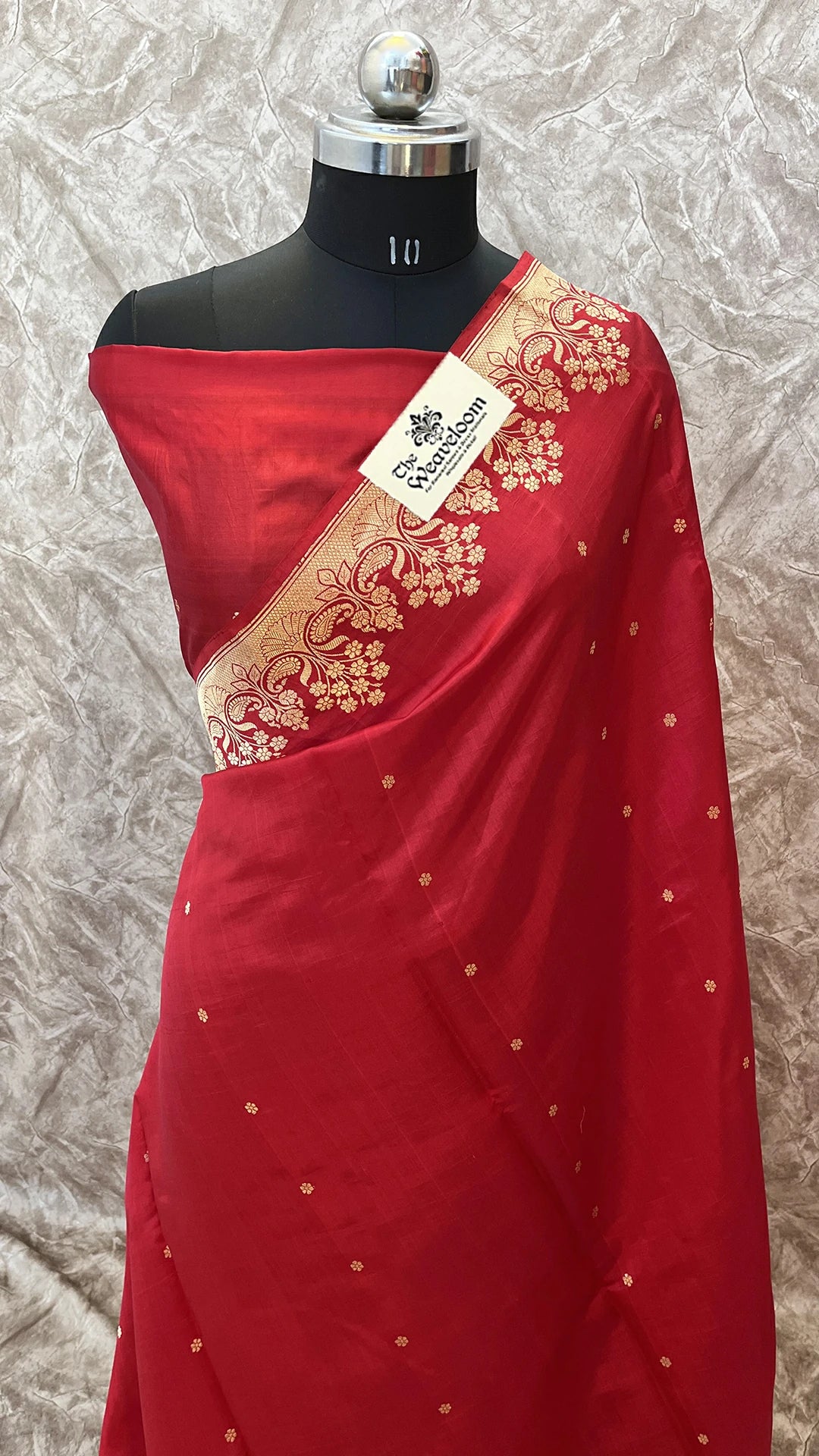 - Rich Red base with intricate Golden Zari floral border & heavy pallu