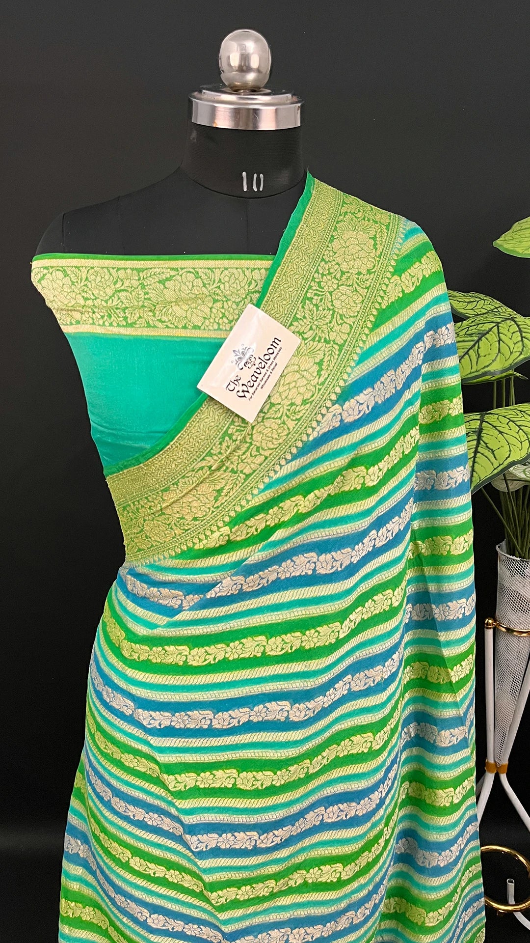 This saree is a celebration of color, comfort, and craftsmanship. With its fluid crepe georgette fabric, elegant rangkat stripes, rich golden zari, and versatile sea green palette, it offers everything you look for in a premium Banarasi saree. Whether styled for a wedding, festive event, or special occasion, it promises effortless elegance every time you wear it.